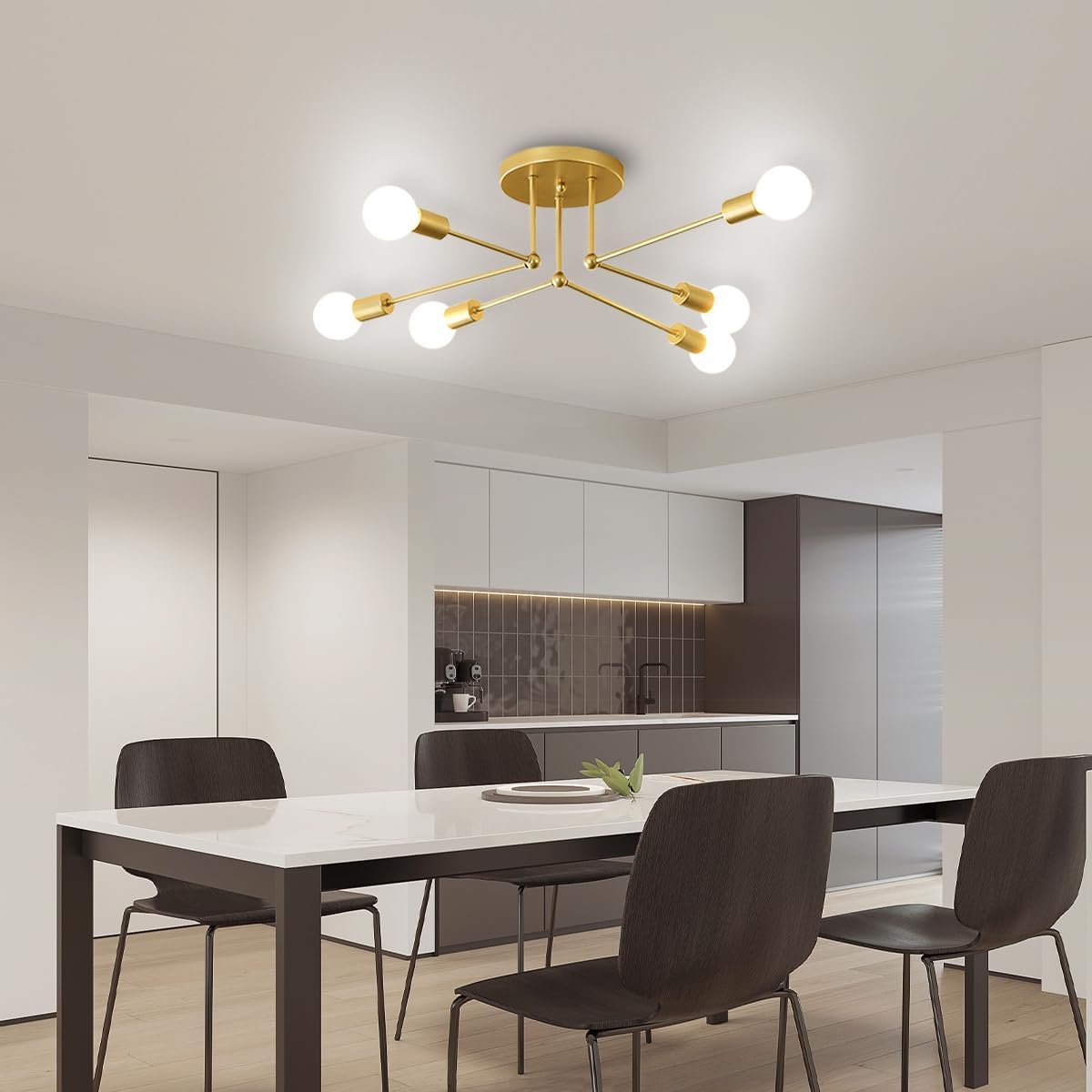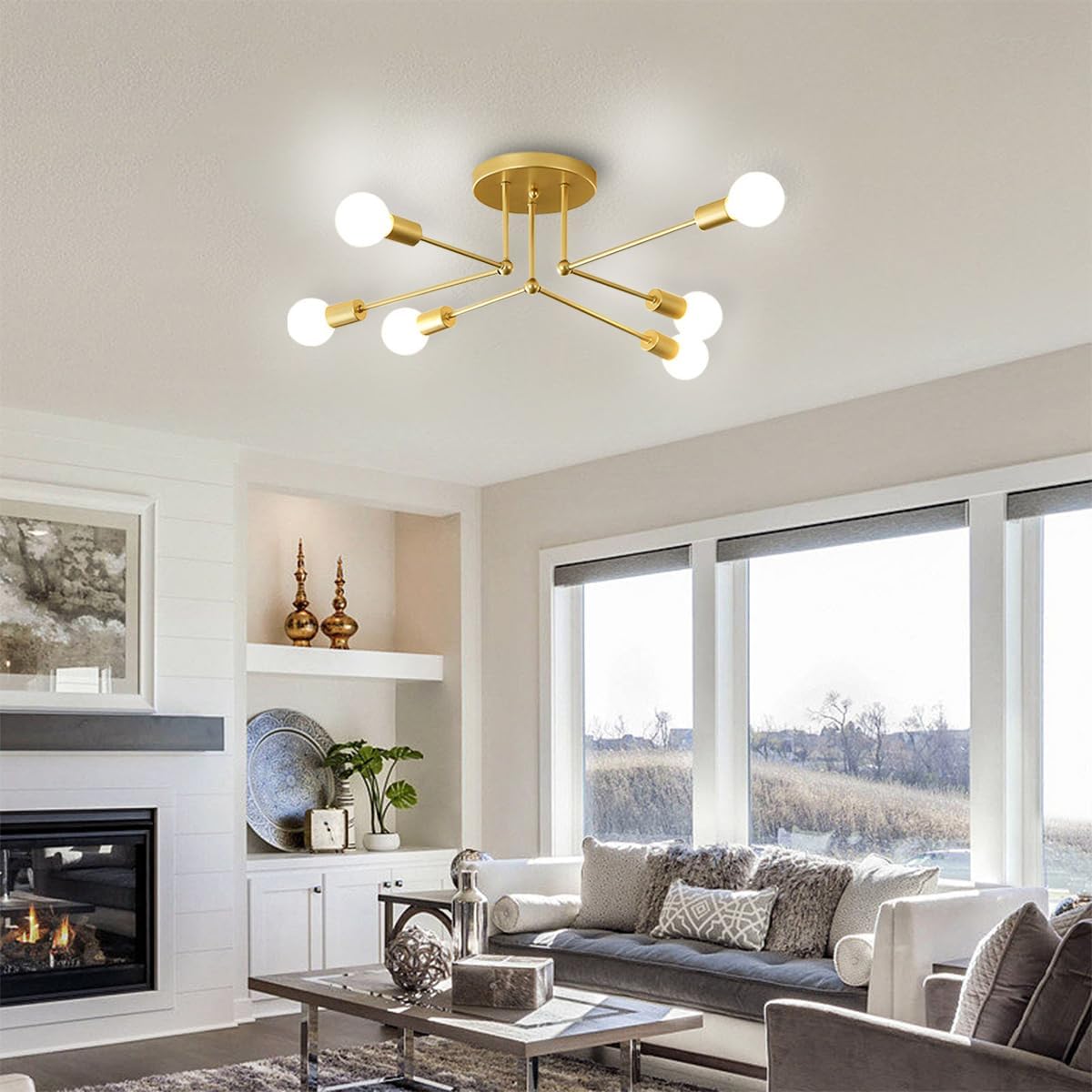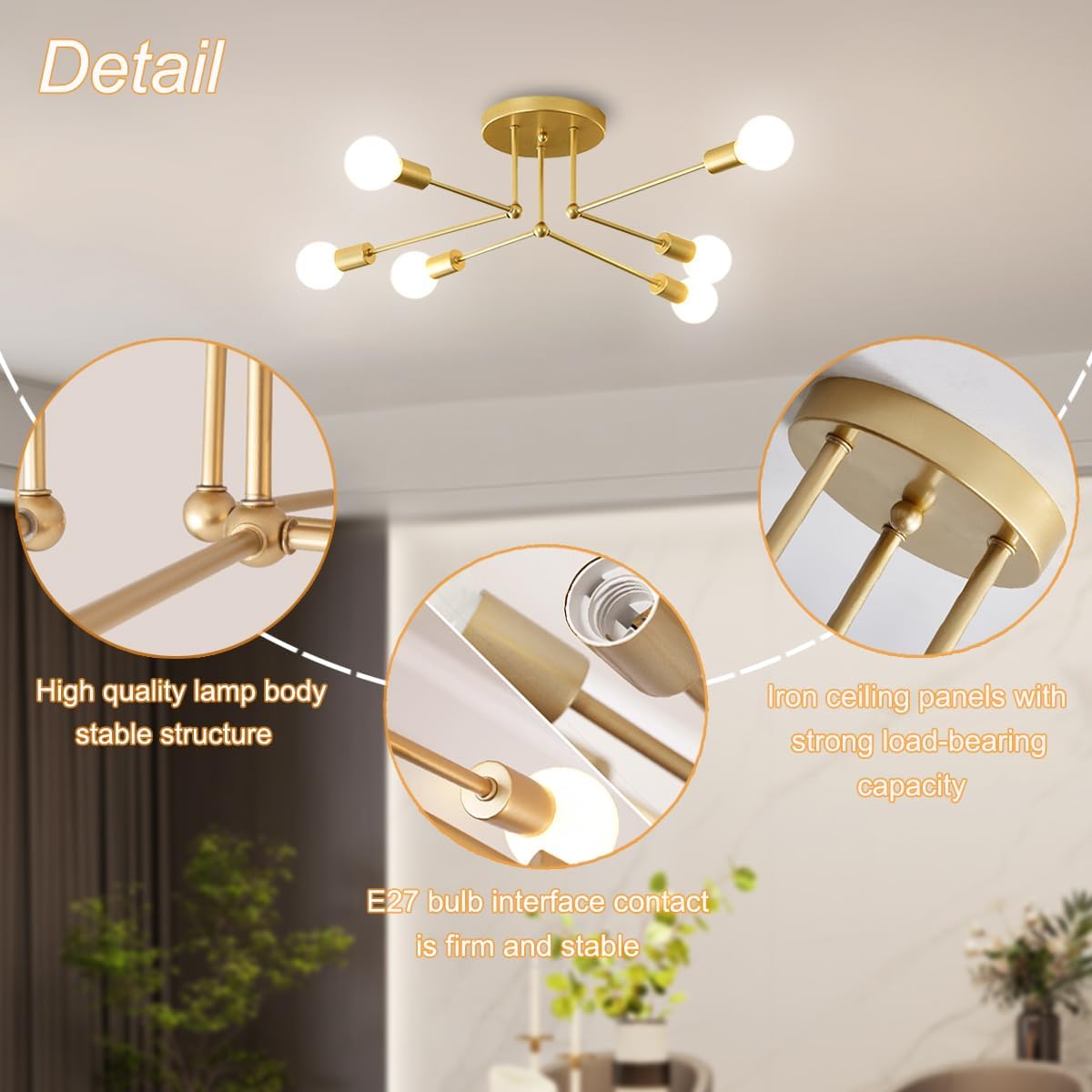 Setzen Sie ein Statement mit dieser atemberaubenden mehrflammigen Deckenleuchte aus goldenem Eisen, die entworfen wurde, um Ihrem Wohnbereich zeitgenössischen Flair und warme Beleuchtung zu verleihen. Die elegante goldene Oberfläche und die gruppierte Lichtanordnung bieten einen luxuriösen Akzent, ideal zur Schaffung einer anspruchsvollen Atmosphäre in modernen Innenräumen.